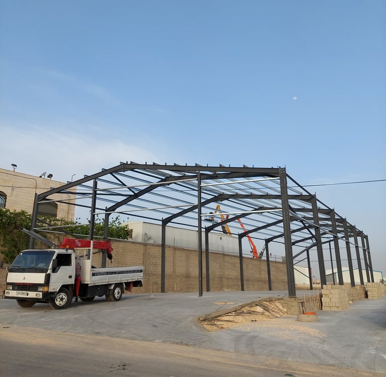 المستودعات والمخازن الصناعية : تصنيع وتركيب احترافي للهناجر ذات المساحات المفتوحة (High-span) والمظلات الصناعية الضخمة بمواصفات عالمية.
